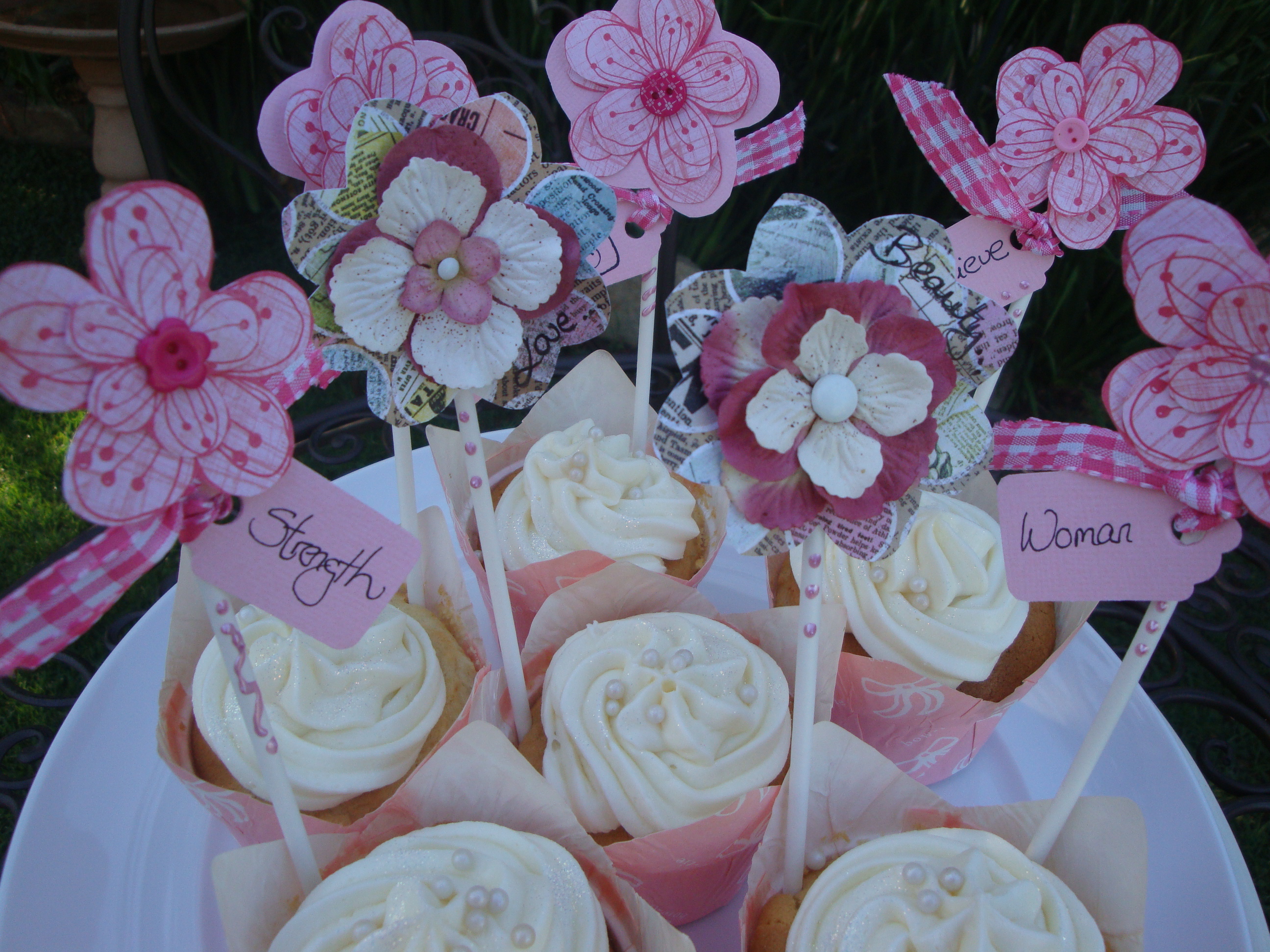 I was invited to display my cupcakes and for the morning I decided on pink sugar paste Cancer Awareness ribbons and roses for some of the cupcakes. To add something different to my sugar paste decorated cupcakes I made cupcake toppers using scrapbook paper and embellishments to make flowers and tags for the toppers. I finished off each topper with a ribbon and wording and stuck them onto a white lollipop stick. The cupcake toppers added a pretty visual height to the display.