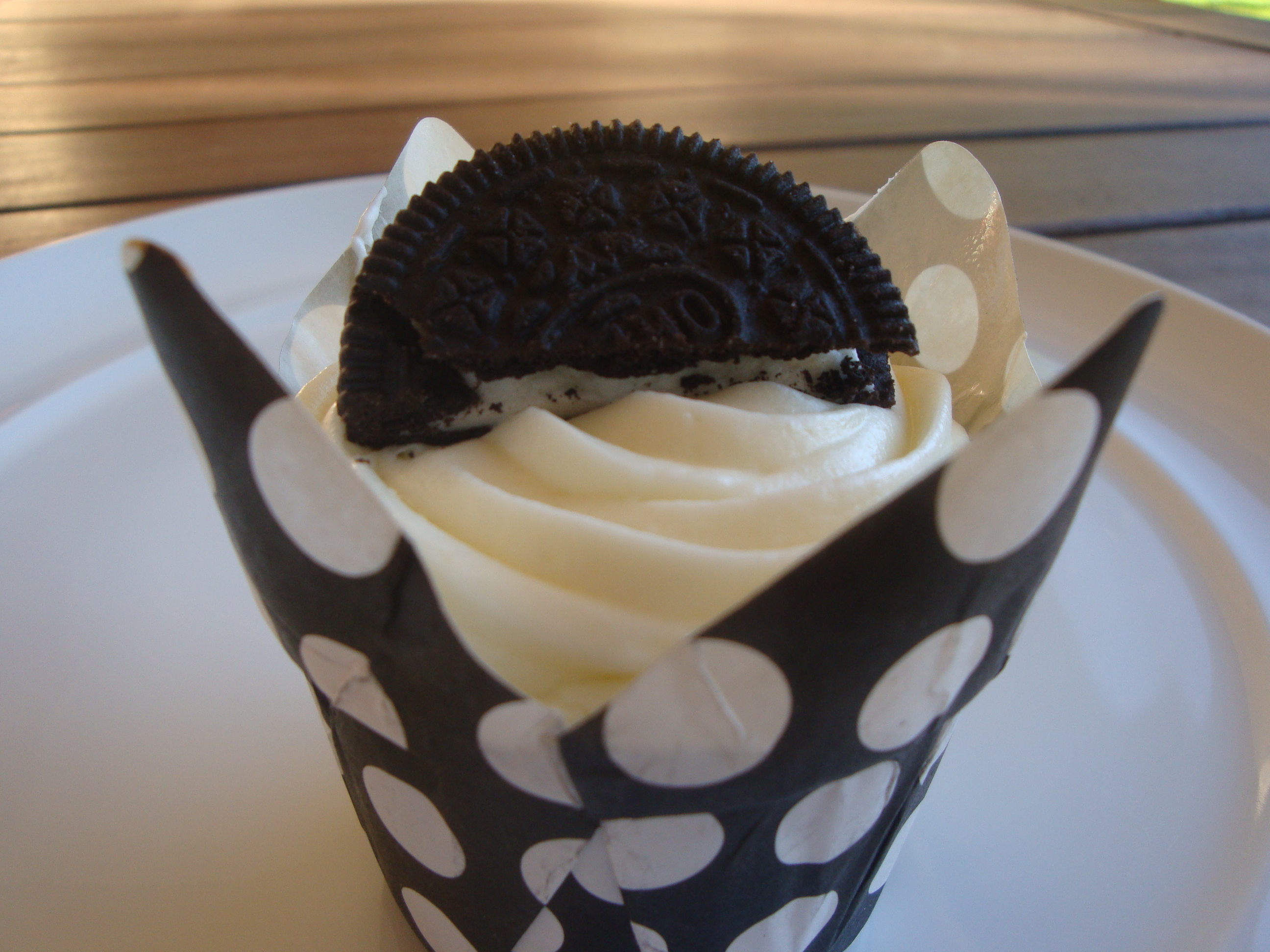 Yesterday I wanted to make cupcakes to celebrate her achievements and wanted a cupcake with an American theme so I thought of Oreo Cupcakes. Luckily I had a packet of the dark chocolate Oreos with the creamy white centre hidden away in the grocery cupboard and I took 6 and twisted them so that I had half an Oreo with its white centre to pop into 6 cupcake holders.