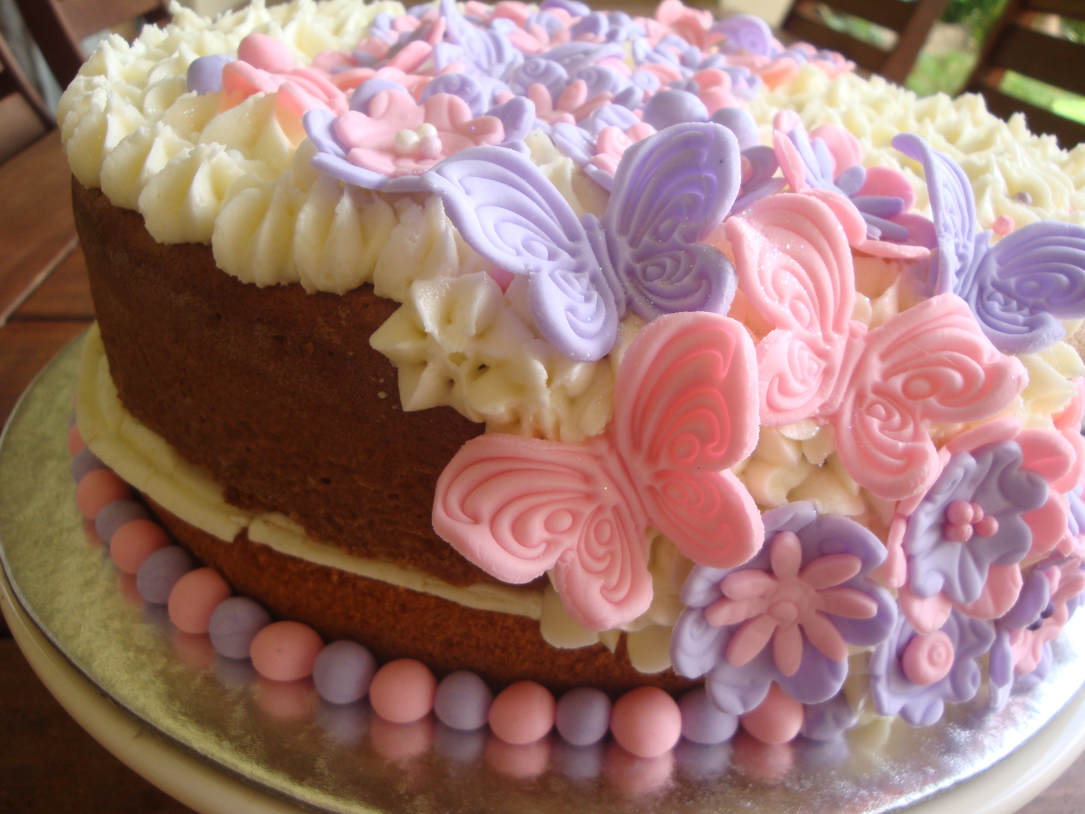 Everyone has something that they go dilly over and those who know me well know that yes I go dilly over anything to do with cupcakes but my real love is for butterflies.  I have now made countless butterfly cupcakes in every colour and on Sunday I was delighted to be able to make my first butterfly cake. This cake was ordered by Jean, a very excited granny, for her granddaughter’s birthday party.  Ashleigh was turning 6 and she wanted butterflies and flowers on her cake and cupcakes and they had to be pink and lavender.  I had a picture in my head of flowers and butterflies cascading gently over the top of the cake and down the side.  It was brilliant when I saw the cake translate from the image in my head to this really pretty pastel birthday cake.  I finished off the edge of the cake with pastel pink and lavender sugar paste balls, an idea that is seen in so many baking magazines now but one I hadn’t tried out before.  Hats off to the sugar art crafter who started this trend as it completes a cake beautifully and just gives the cake a more contemporary feel as opposed to the piped icing edging I had been using to complete my cakes.