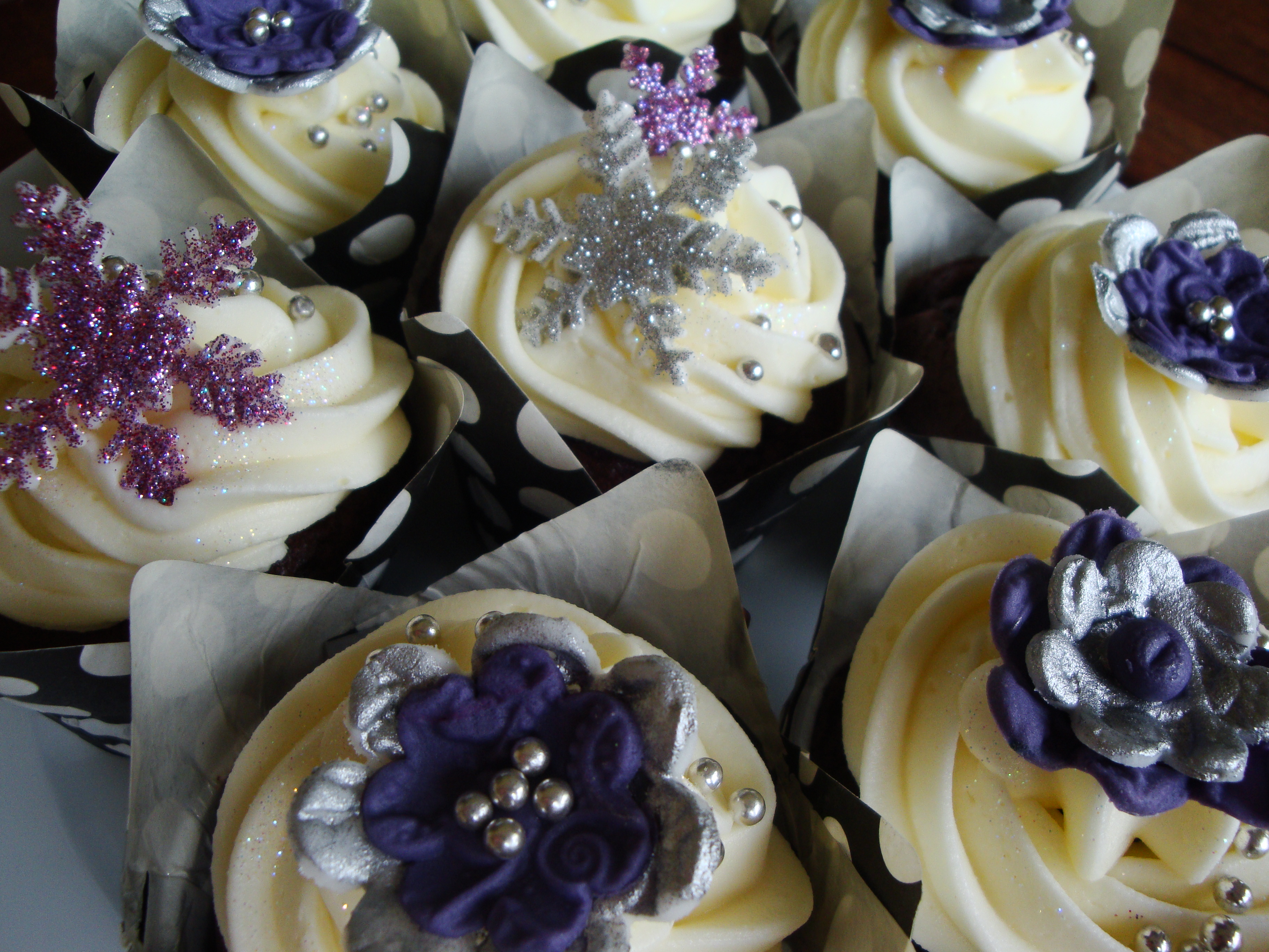 It was to my delight that some of my customers ordered non traditional cupcakes this year and I could enjoy the new colours of Christmas through these rather different cupcakes. These were really different – purple and silver! I cut out white snowflakes from sugar paste and then sprinkled some with silver and the rest with purple edible crystals. I cut out flowers in different sizes and embossed them and then layered them giving them centres of shiny silver balls. To complete the elegant look for each cupcake I sprinkled them with a few silver balls and a shimmer of glitter.