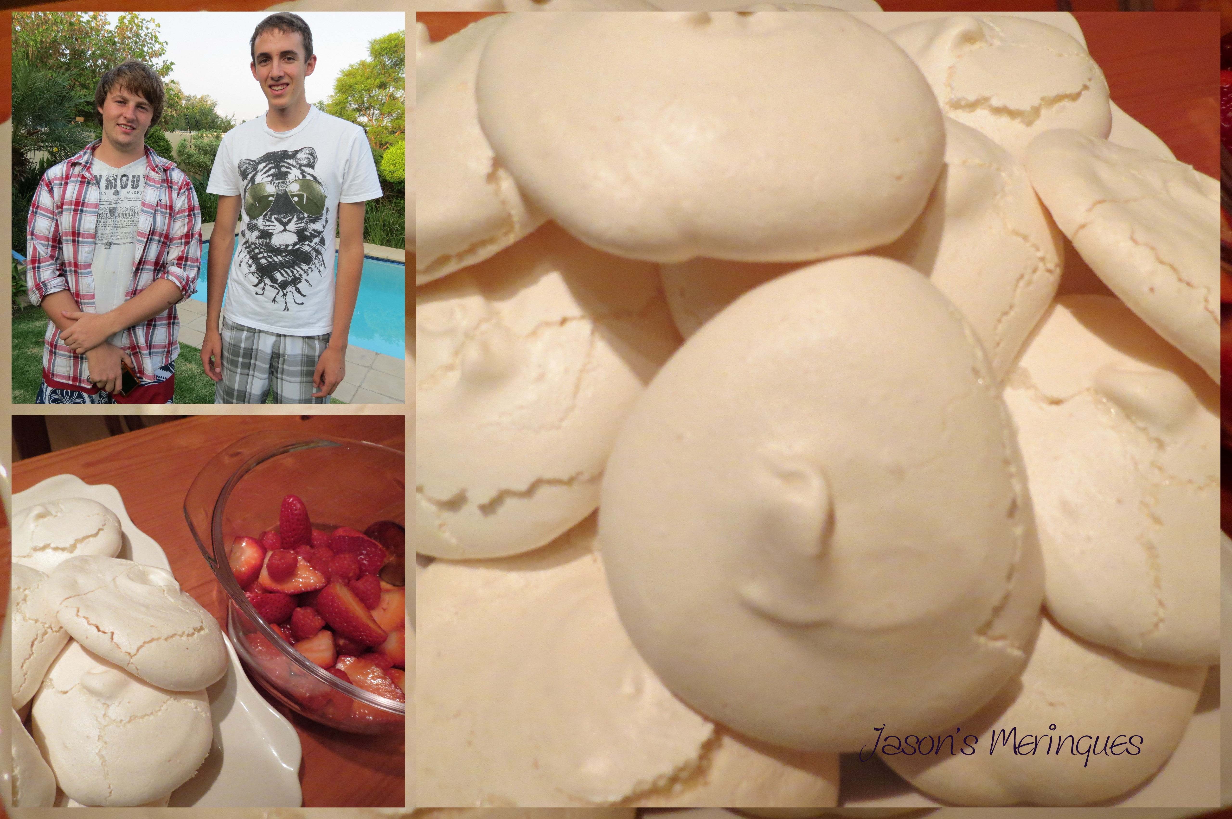 An interesting young man found his way back into our lives this past week after 7 years and a post about him is appropriate because of his passions in life and his enthusiasm for all that is wonderful about food. Jason was a school friend of Teigh’s up until grade 4 when he left for Adelaide. I have fond memories of him and Teigh traipsing across the Trinity school field nearly every other day claiming an urgent need to spend the afternoon together and enthusing about how little homework they had been given on those particular days. His mom Nicole and I remember these 2 young friends spending countless hours together and it was a sad loss for Teigh when Jason moved to Oz with his family, leaving behind a stubborn cat to remember him by. Jason was given a trip to South Africa for his 18th birthday and he visited us for a week during his amazing trip. He made us these delectable meringues one evening when I mentioned that pavlova was Teigh’s favourite dessert. Not sure if you can claim to have met an 18 year old who travels from Oz to Africa with a full size version of the chef’s bible, Larousse Gastronimique but I certainly can now! Imagine my surprise and delight when out came this beautiful book and Jason produced a recipe for these gorgeous meringues. I added some caramel vodka to the strawberries and raspberries and we had a desert to remember that night.