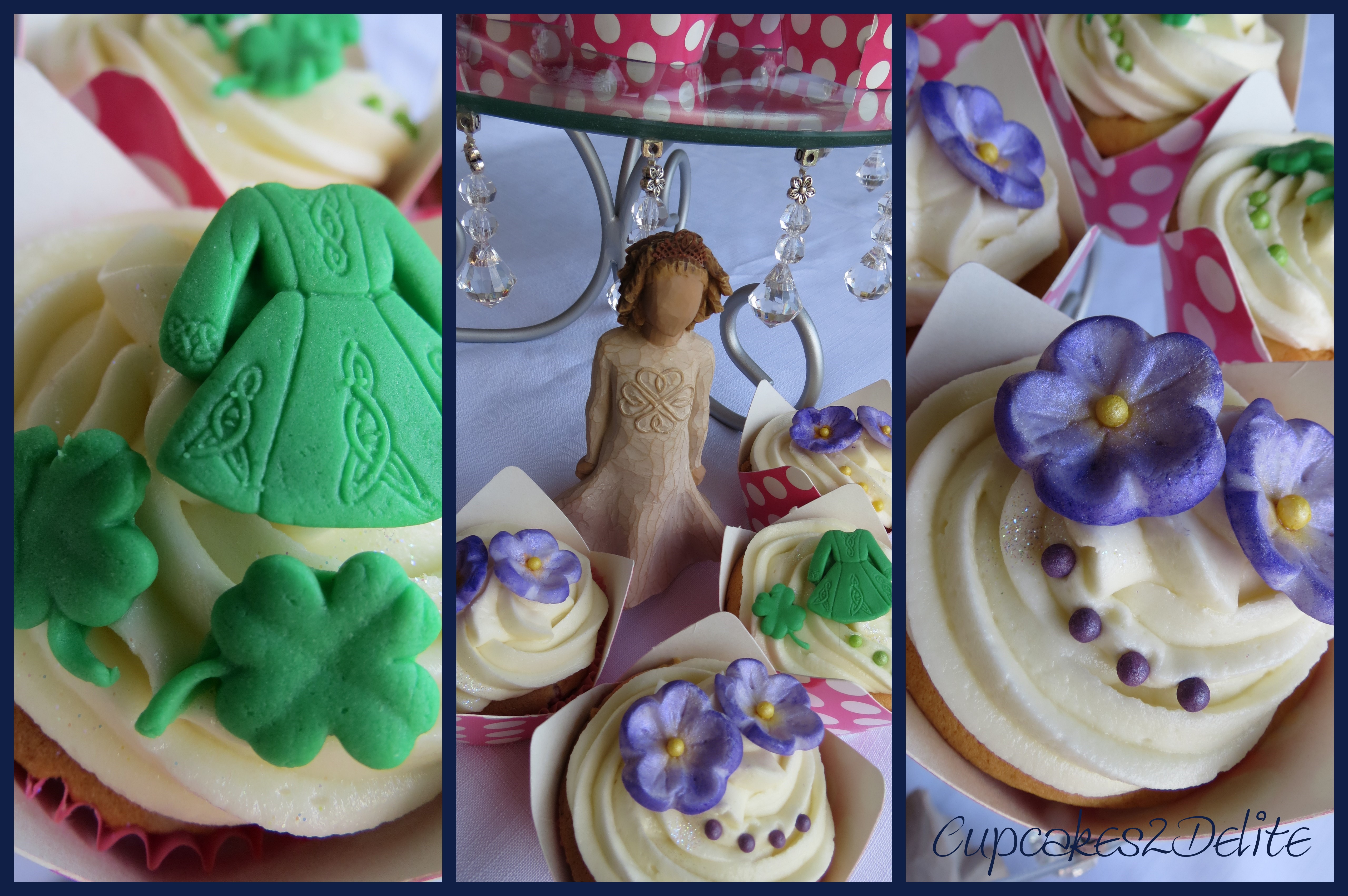This unusual cupcake combination was ordered by Lisa for a delightful sounding – young at heart- lady by the name of Nora who was celebrating her birthday. I love that Lisa asked me to do cupcakes with Nora’s favourite flower – violets – and also represent Nora’s Irish heritage in the same order! Lisa chose the pink polka dot cupcake cases to match the decor of the party and I couldn’t resist photographing these pretty cupcakes on Russell’s beaded cake stand and adding the petite Willow Tree ‘Irish Charm‘ figurine to my display. Her exquisite curls and Irish charm seem to capture everything that Lisa wanted to celebrate with Nora on her birthday.