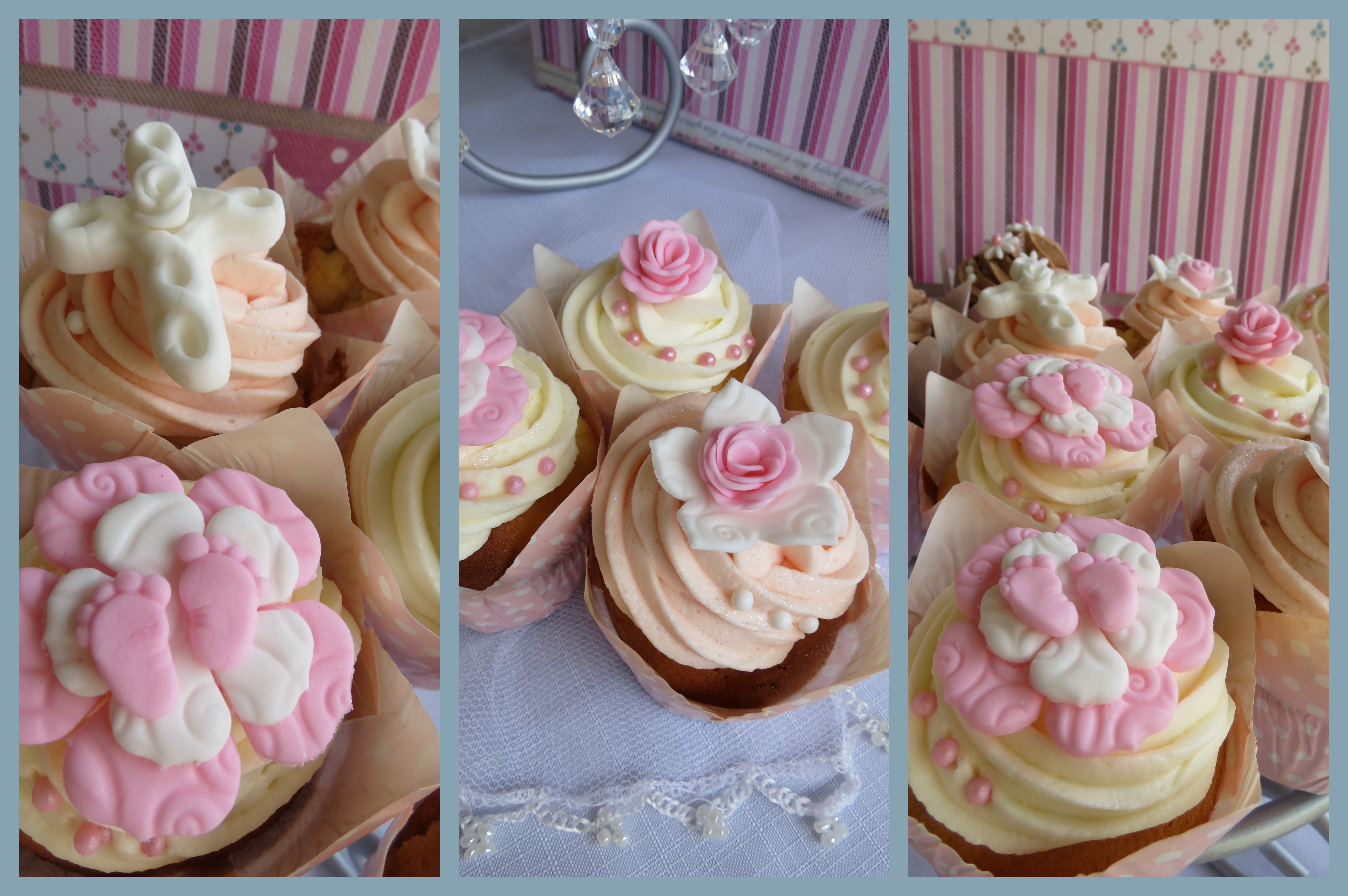 To celebrate the christening of her little girl, Giuliana, Penny ordered these pink and white christening cupcakes. In keeping with the colour scheme I did vanilla cupcakes with a creamy vanilla icing, strawberry cupcakes with a pastel pink strawberry icing and chocolate cupcakes with a light midnight velvet chocolate icing. The sugar paste flowers were embossed and layered and then topped with the initial G for Giuliana. I finished the G with a small sugar paste blossom button. On the single embossed flowers I put small moulded babies feet to represent the journey Giuliana’s feet will soon embark on as she grows into a little girl. To signify the religious importance of this celebration I moulded crosses from sugar paste and finished them with a small white rose.