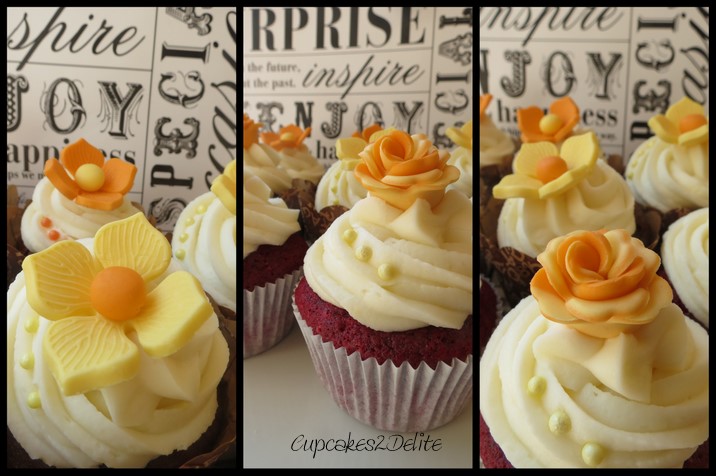 As I mentioned in my last post, Shaunagh and I shared a birthday 2 weeks ago, and our celebration at scrapbooking was a brilliant one with cake, presents, loads of laughter and of course a few cupcakes. Having recently fallen in love with a few new blogs including Sam Linsell’s blog http://drizzleanddip.com/ with her exciting recipes and mouthwateringly beautiful photography I decided to try out a new recipe for Shaunagh’s birthday cupcakes from Sam’s blog. Her Best Ever Red Velvet Cupcakes looked really tempting and true to her word these cupcakes not only looked red and chocolatey but also tasted delicious. I added some pretty orange and yellow flowers with bright centres to some of the cupcakes and then combined the yellow and orange sugar paste to make some roses for the others. The result was cupcakes that are as bright and fun as Shaunagh herself is with a beautiful feminine finish.
