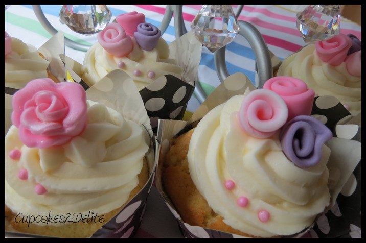 For her baby-shower, Georgina chose these cupcakes with simple pink and lavender sugar paste roses on them. I made delicious vanilla and white chocolate cupcakes and then decorated them with a selection of roses and rolled roses in pinks and lavenders and matching sugar pearls.