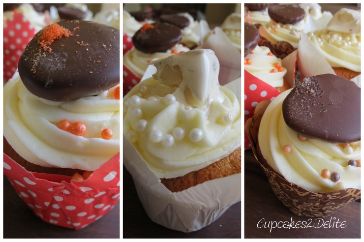 Congratulations Wendy for being my top commenter on Cupcakes2Delite! Every time I receive a comment on my blog I get the same tingly excitement I had at Christmas as a kid wondering what was hidden in all the beautifully wrapped presents under the tree. Thanks Wendy for taking the time to leave all your comments on my blog….you are the Bees Knees! Another first for the year is your birthday you celebrated a few days ago and I wanted these birthday and thank you cupcakes to be a little different for you. I made an orange cupcake with vanilla icing and finished off with an orange filled chocolate disc, the second flavour was a vanilla cupcake with a hidden nougat centre and vanilla icing and nougat to top it. The final flavour was a vanilla cupcake with a caramel syrup, vanilla icing and burnt caramel filled chocolate disc (thanks to Woolworths for their gorgeous chocolate products and nougat which inspired the flavours for these cupcakes). I hope you have as much fun eating these cupcakes Wendy as the fun I have reading all your quirky comments!