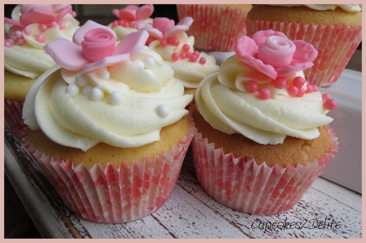 With Jo celebrating her Sweet Sixteenth Birthday this year her mom,Liz, asked me to do cupcakes for the celebration and she chose a Strawberries and Cream theme for the cupcakes and decor. She surprised Jo with pizza, balloons, presents, cupcakes and messages from all her friends during her school lunch break. I baked Strawberry and White Chocolate Cupcakes in these delicate pink and white flower cupcake cases and then made a creamy vanilla icing to top them. I cut flowers in a variety of shapes in deep pink, pale pink and white and then combined them giving them either a contrasting rolled rose or beaded centre. Immediately after icing the cupcakes I gave each one a sprinkling of pink or white beads before adding a flower. Thanks Liz for your order of these cupcakes for your delightful daughter and I am pleased that Jo enjoyed her surprise and her cupcakes.