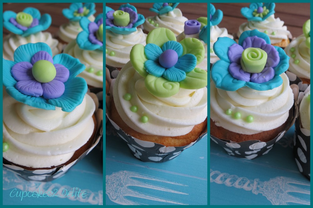 If you have read my previous Mermaid Cupcake post you will know how thrilled I was with Vicci’s help with my mermaid’s face. Well to add to the excitement of the week, Vicci told me about the National Sugarcraft show which was held in Pretoria. I made the great trek from Joburg to Pretoria and visited all the exhibits at the show and was thrilled to see such exquisite sugarcraft on show. Even more fun were all the stands with new products on display. One of the products I purchased from Incredible Crafts was a fmm Multi Fower Veiner which I have used on some of the flowers above. I simply cut out my flowers and then popped them between the veiner which left them with a detailed veined surface. I combined turquoise, lime green and purple flowers and colourful centres for these cupcakes inspired by Byron and his girlfriend’s 4 year anniversary. I thought these funky flowers were a perfect addition to cupcakes celebrating young love.