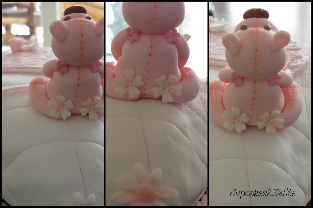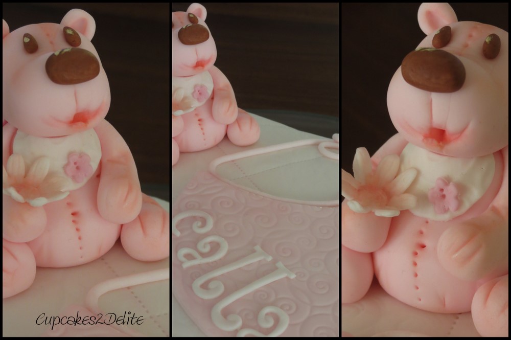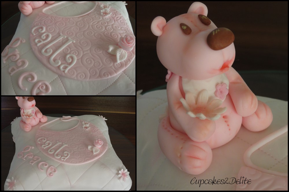 A Teddy Bear Cake especially ordered by Lisa (TQO)’s for the christening of her god-child, Calla Grace.  I was excited to craft another teddy, this time a pale pink one with brown nose and white trim.  I am amazed that every time I make a teddy I am transported back to Grace Stevens class where I first learned to work with sugar paste in this way and I love that I am able to remember each step she taught us in this particular class.  Lisa requested a pillow cake covered in white sugar paste with a pretty embossed bib on it and then also wanted Calla Grace’s name included in the design.  Thanks Lisa for this gorgeous order and great design which made it really easy for me to envision and put together.  I loved meeting all your family and your beautiful god-child Calla Grace.