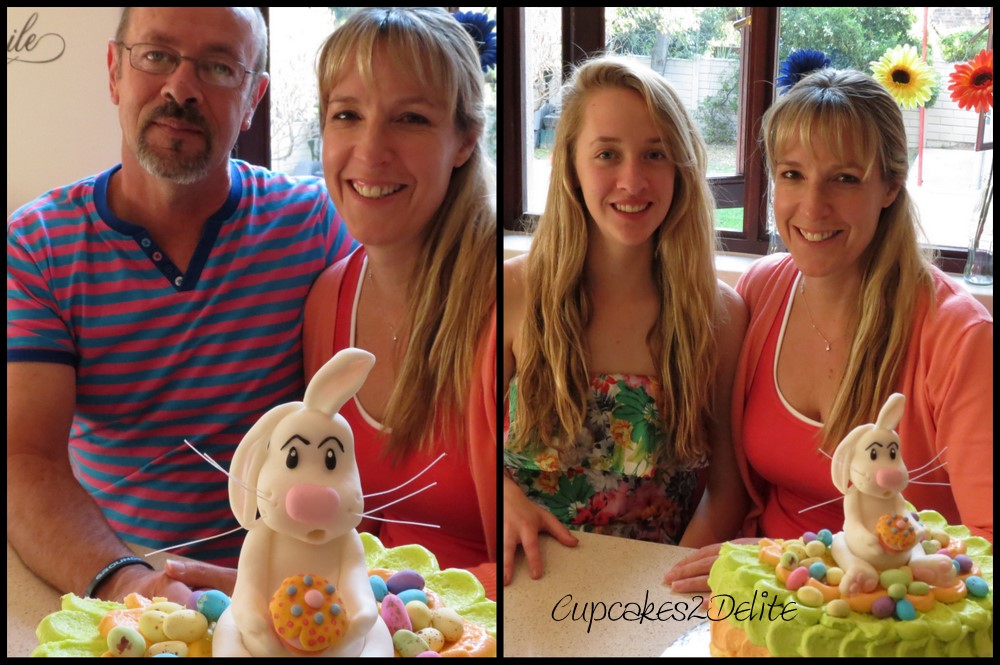 I made a butter cream icing which I also divided into 4 and coloured each to match the sponge layers. I used a vanilla butter cream to smooth between each layer and then created the outside effect using the coloured butter cream in small dollops which I smoothed with a teaspoon. The top was finished off with the rather proud sugar bunny and loads of speckled eggs. The sliced cake not only looked but also tasted delicious.