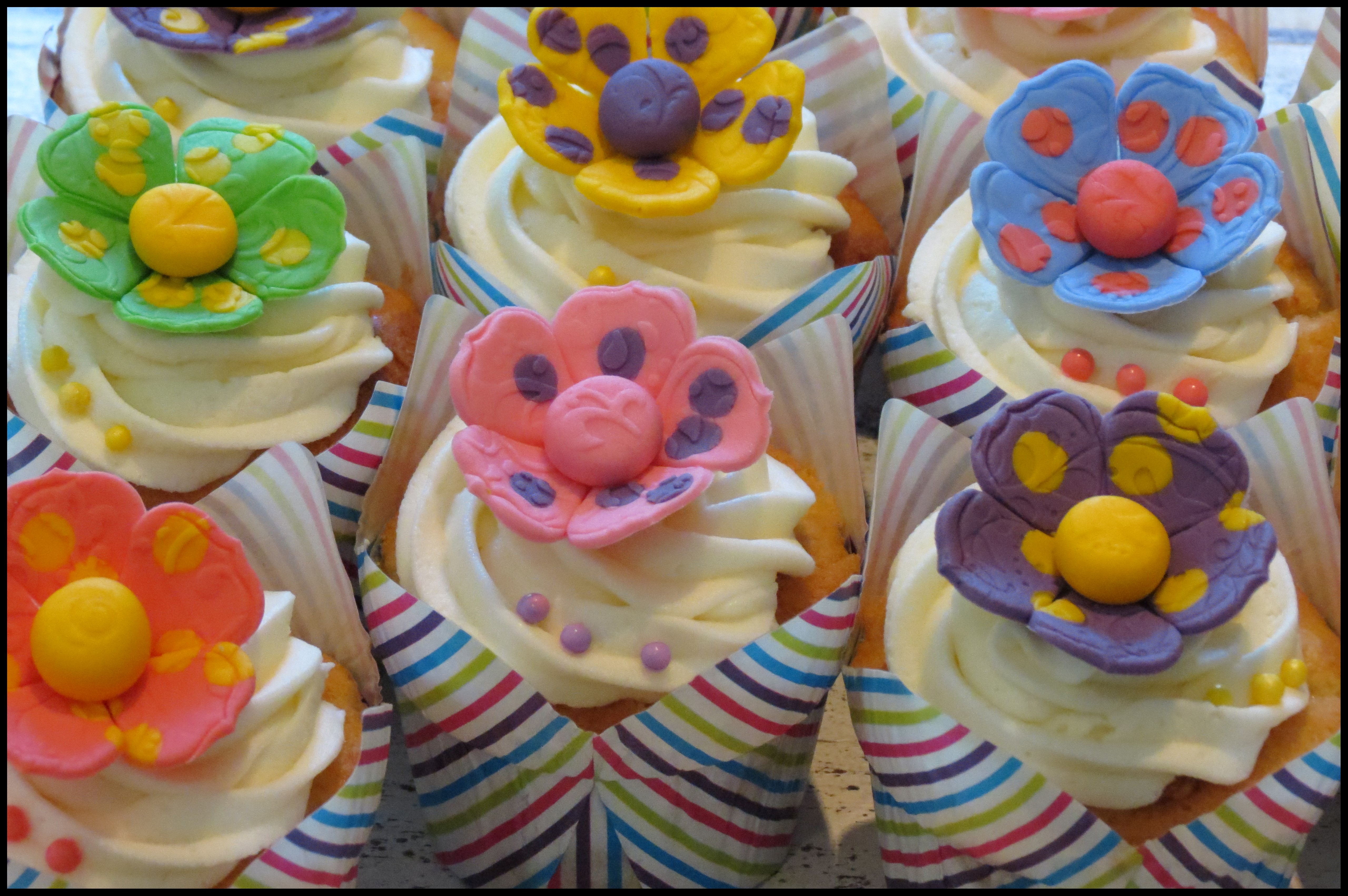 Most of my friends know that I go a bit dotty over dots and I love any opportunity to add polka dots to my life. I am not sure if Debbie knew this when she asked me to do these Polka Dot Flower Cupcakes for her. I used a variety of colours and added small sugar paste circles to the colours before embossing and then cutting out the blossoms. I used contrasting sugar paste balls for the centres of the flowers and then pressed my embossing mat gently on to each centre to both flatten and emboss them. The result was these really charming and colourful cupcakes with their dotty flowers!