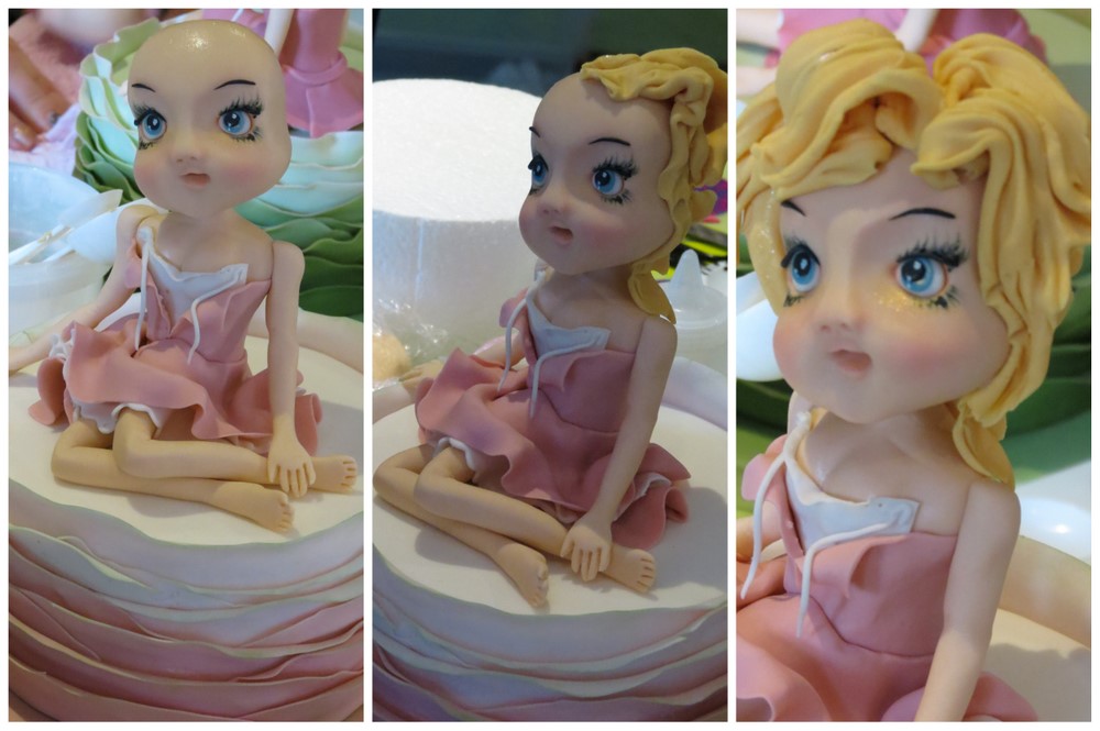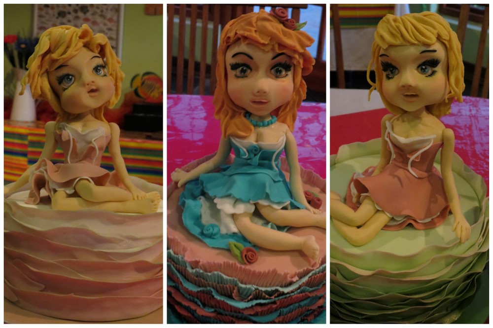 What a fun 2 day course we had with Vicci of Victoria Bean Bakery learning to craft her Little French Girl out of sugar paste last Thursday and Friday. Vicci just oozes sugar art talent and her passion for everything she does in life is highly contagious. Not only is she an amazing baker and sugar artist but she is a wife, mom, friend and now also a teacher of her amazing skills. We have been admiring Vicci’s characters for a while now and we were all delighted when she announced her new class. Not only did we learn so much from this amazingly talented sugar artist but we learned from each other as we chatted about our own cake and sugar art experiences, all priceless information you can’t pick up from a book! Above are a couple of pictures of Vicci demonstrating her French Girl on a ruffled cake and below you can see Vicci’s delightful character winning her way into our hearts.