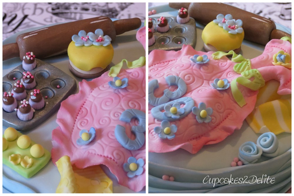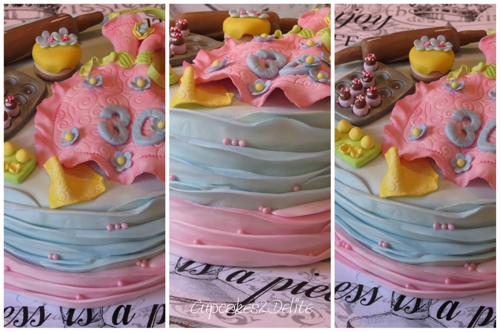 Jeanine is another client of mine who is passionate about the cupcakes and cakes that I make and as she has an appreciation for all things beautiful this cake had to be extra pretty. Jeanine ordered a cake for her daughter’s 30th birthday celebration and as she is a baker I thought it would be cool to add baking goodies to the top of her cake. The miniature eggs in their egg box, the cupcakes and the cake are all sugar paste and I used pastel colours to match the colour scheme for the birthday. To get the silver shimmer of the baking tray I dusted the finished tray with a Rolkem lustre powder before adding the tiny cupcakes with their sprinkled tops. I finished the cake off with layers of pastel pink and blue ruffles and a pretty embossed pink apron.