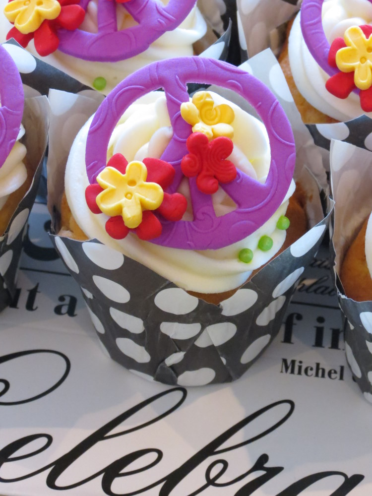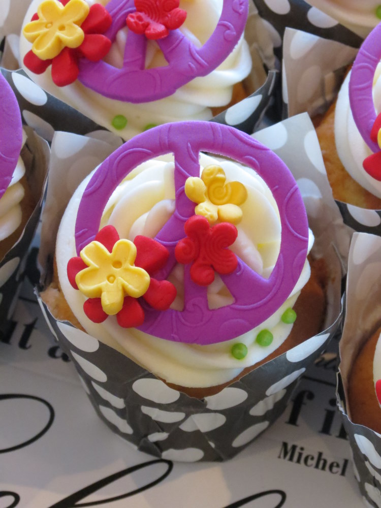 Linda’s brief to me for her daughter Michelle’s Cupcakes was that they had to be Hippie Themed and colourful. I have used this peace sign numerous times on cupcakes but decided to jazz it up a bit by embossing my purple sugar paste before I cut the peace sign and then totally hippie-fying them with added embossed yellow and red flowers! The delicious swirls of vanilla buttercream were decorated with the colourful peace signs and then I added tiny green pearls for a final pop of hippie colour. Who would not want to dive into a birthday celebrations with these cupcakes?