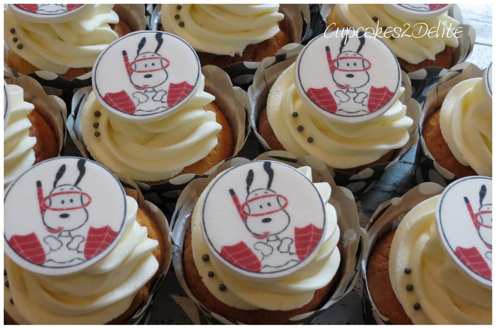Karen ordered these cute cupcakes for her daughter’s swimming team. This little Snoopy with his goggles and flippers is their mascot so I had him printed onto edible paper and then cut them and let them dry on sugar paste discs before topping the vanilla swirled cupcakes with them. The girls were delighted with these Snoopy mascot cupcakes and I’m sure after a hard training session they went down well!