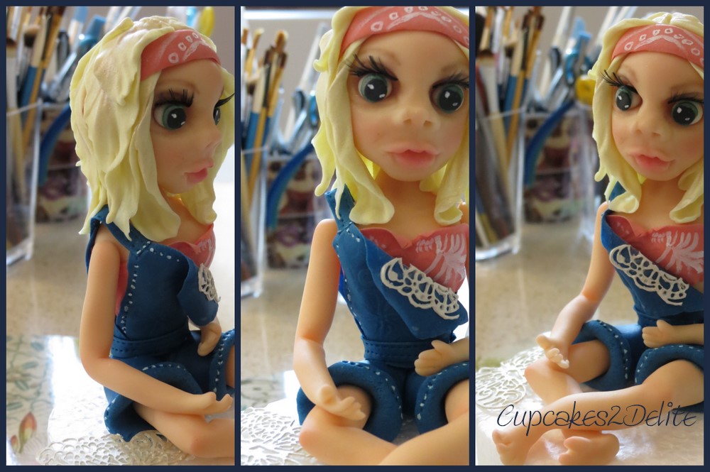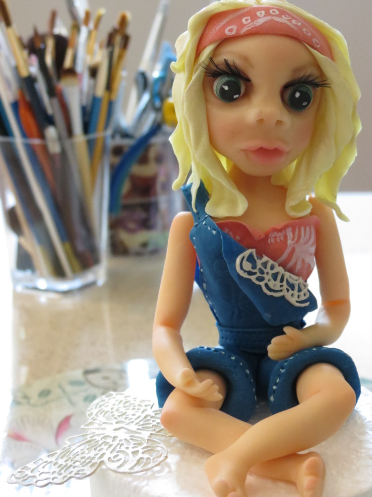 Yolanda of Crave Cakes asked me to do a Hippie Figurine for a 21st birthday cake. A friend of her daughter was celebrating her 21st with one of Yolanda’s cakes and knowing her well Yolanda sent me the brief and photos of a beautiful blonde young woman with a gorgeous hippie style. I created this mini sugar figurine in blue stitched denim dungarees to show off long slim legs and a cute printed bandana top as well as a hand painted bandana to hold back her blonde sugar tresses.