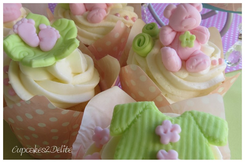 I added 2 baby pink feet to embossed pastel green flowers for these cupcakes that Alison ordered to welcome a new baby girl into their family. They look so cute nestled in the flower on these cupcakes. The teddies I molded from a sculpey clay mold and added a pastel green flower to it before settling it on to the cupcake with some rolled sugar paste roses. The pink sugar paste boottees with their green blossoms and pastel green babygros with their blossom buttons complete this baby girl cupcake order. I hope these only enhanced this special day for you and your family Alison.