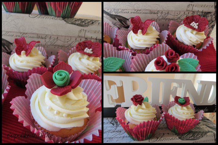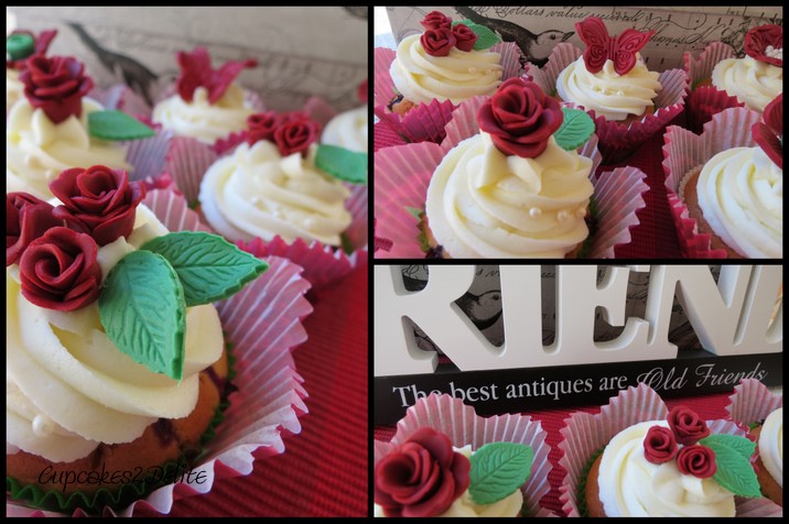 Great and true friends are a treasure to be cherished and Michelle is one of those friends. In fact I don’t think that her special day on Thursday was long enough to receive all her beautiful birthday messages and calls and also celebrate and open wonderful presents. Of course Michelle took it all in her stride and certainly celebrated aging another year with grace and style. When I first spotted these burgundy and green Wilton’s cupcake holders in Kadies, Fourways I knew immediately they were perfect for Michelle’s birthday cupcakes. I made creamy blueberry, vanilla cupcakes with a vanilla cream cheese icing in green cupcake holders. I popped them into the beautiful Wilton’s holders once they were baked as this preserves the beautiful colouring of the holders. Not resisting my instinctual urge to match colours, I made burgundy sugar paste roses, miniature roses and embossed flowers to decorate the cupcakes.