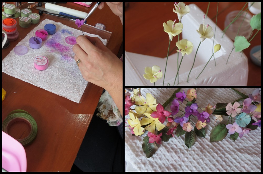 The Fairy on a Cushion Cake was the workshop Grace Stevens of Cupcakes By Design gave on her second day here in Johannesburg. After doing the Filler Flowers and Teddy Workshop I couldn’t wait to do the 3rd workshop. Once again we were hosted by Vicci in Northcliff and it was brilliant to spend time again with these 2 extremely talented ladies and meet new people who were just as keen to learn from Grace as I was. The pictures below show our work in progress, from top left all the dusting colours and gel colours we had to decide on for our fairies and their flowers, bottom left my fairy with her feet up waiting patiently for a pretty hairdo and wings and finally Grace’s swift hands deftly demo how she covers her cushion cake ready for her fairy to rest on.